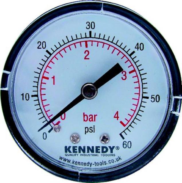 Ausgestattet mit 1/8” BSP- Messinggewinde, kann für PSI und bar Messungen verwendet und direkt an jeglichen Filterregler-Nebelölern befestigt werden. 50 mm Durchmesser. Druck 0-12 bar. Hergestellt aus robustem ABS-Kunststoff. Rückseitige Beschläge.