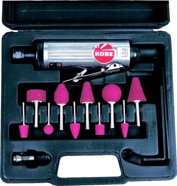 Luftdruck 90PSI (6.3 bar), Luftverbrauch 4CFM* (144 l/min), Drehzahl (U/min) 22000, Gewciht 600g. Gesamtlänge 170mm. Mit 3 und 6mm Spannzangen, 10 sortierten Schleifstiften und einem robusten vorgeformten Kunststoffkoffer.