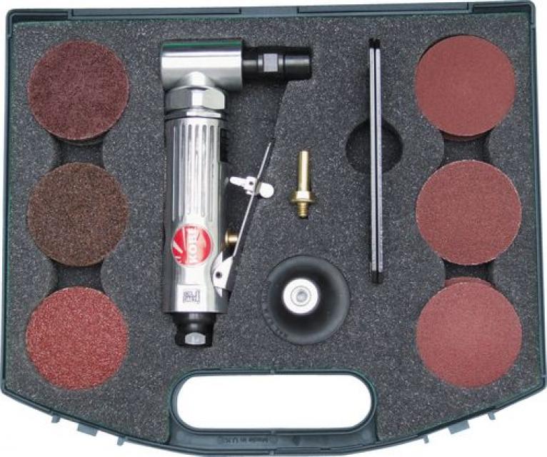 1x 6mm Ø-Schaft, um die Klettscheiben zu befestigen. Ein Kobe Winkel-Stabschleifer mit 1/4” NPT-Anschlussgewinde für 10mm Luftschlauch, Luftdruck 90PSI (6.3 bar), Luftverbrauch 4CFM* (144 l/min). Drehzahl (U/min.) 20000, Gewicht 1,25kg. Wird in einem stabilen Kunststoffkoffer geliefert.
