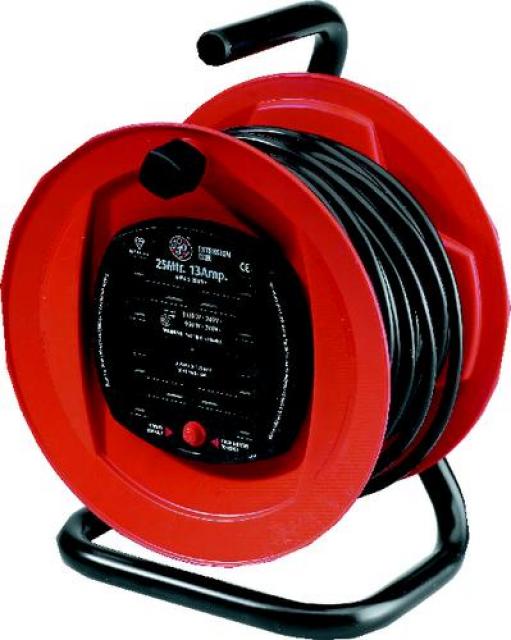 Kabeltrommel, offen 4-fach Steckdose, Stahlrahmen und hochschlagfeste Kunststofftrommel. Komforttragegriff. Mit Überhitzungsschutz. Maximale Belastung 13A/3120W. Spannung 240V. Kabellänge 25m. Gemäß BS 5733 und BS EN61242:2004.