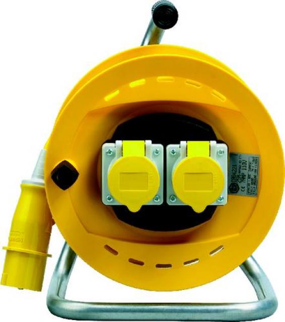 Kabeltrommel Polycarbontrommel mit Seitenrändern und 2-fach Steckdose. Kältestabiles Kabel. Kabellänge 40m, 2,5mm² Kernkabel. Maximalbelastung 16A/1760W. Spannung 110V. Sicherheitsknopf. Gemäß BS 5733.
