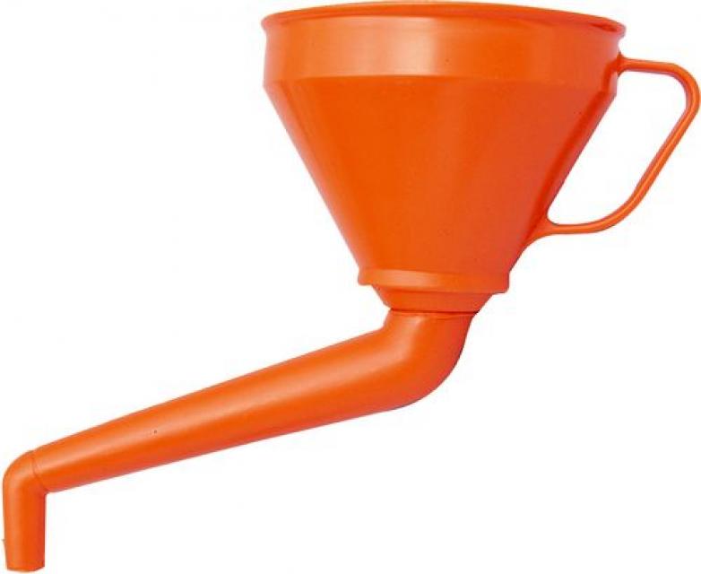 Kunststofftrichter Mit Überlaufrand, herausnehmbarem Messingsieb, integriertem Griff und starrem, abgewinkeltem Auslaufrohr. 160mm Ø.