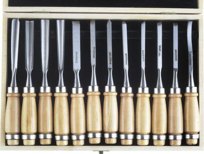Klingen aus legiertem Stahl. Klingenlänge: 110mm, Grifflänge: 95mm. 12-teiliger Satz, Inhalt: vier gerade Hohlbeitel, zwei gerade Meißel, zwei Schrägmeißel, zwei V-Abstechmeißel, ein Furnier- und ein Nutenmeißel.