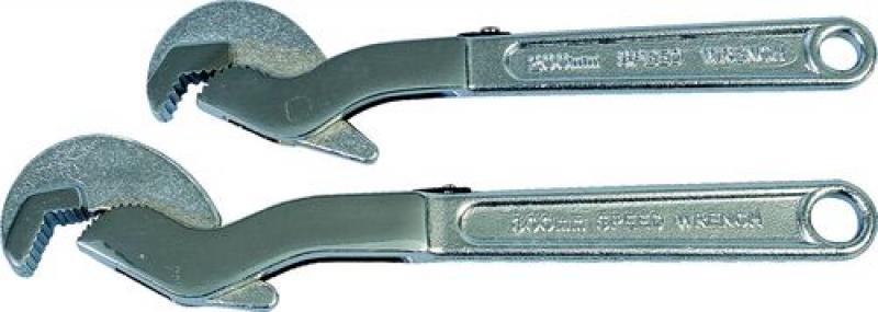 Einhänder-Satz Beinhaltet zwei vielseitig einsetzbare, selbstjustierende Schlüssel, 200mm (8”) max. Spannweite 25mm und 300mm (12”) max. Spannweite 35mm. Für Rohre, Bolzen und Muttern. Aus gesenkgeschmiedetem Stahl, vollverchromt.