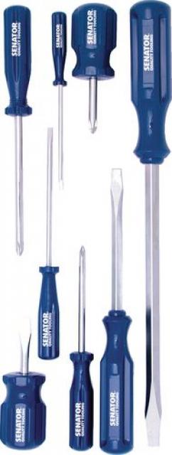 Schraubendreher-Satz Chrom-Vanadium-Stahlklinge mit magnetischer Spitze. Acrylgriff. 8-teiliger Satz, Inhalt (mm): Konisch: 6.3 kurz, 6.3 x 100 und 8.0 x 200. Schlitz: 3.0 x 75 und 4.0 x 100. Kreuzschlitz: Nr.2 kurz, Nr.1 x 75 und Nr.2 x 100.