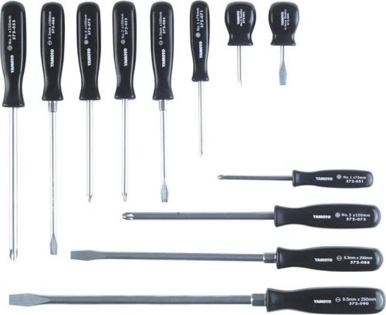 Schlitzschraubendreher: 6.3 Vergaser-, 6.3 x 100, 6.3 x 150, 8.3 x 200 und 9.5 x 250.