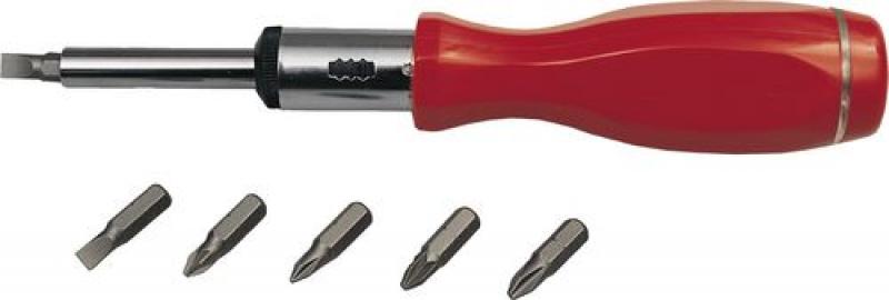 Chrom-Vanadium-Stahlklinge. Im Griff können bis zu sechs Bits aufbewahrt werden. Magnetische Bithalterung. Wird mit 25mm langen 6mm (1/4”) Sechskantbits geliefert. 6-teiliger Bit-Satz, Inhalt: Kreuzschlitz: Nr.1 und 2. Pozidriv®: Nr.1 und 2.