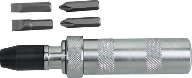 Schlagschraubendreher in Industriequalität mit umschaltbarem Vorwärts- und Rückwärtslauf. Beim Schlagen des stoßfesten Griffes mit einem Hammer, wird die ausgeübte Kraft durch den Innenmechanismus des Schlagschraubers in einen leistungstarken Drehmomentschrauber verwandelt. Ideal, um sicher zu gehen, daß Verbinder fest sind und um festsitzende Verbinder zu lösen. Sechskanthalter kann entfernt werden, um 1/2” Vierkant-Schlagschrauber-Halter aufzunehmen. 5-teiliger Satz, Inhalt: