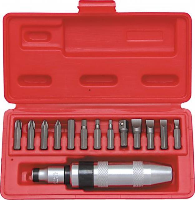 Schlagschraubendreher in Industriequalität mit umschaltbarem Vorwärts- und Rückwärtslauf. Beim Schlagen des stoßfesten Griffes mit einem Hammer, wird die ausgeübte Kraft durch den Innenmechanismus des Schlagschraubers in einen leistungstarken Drehmomentschrauber verwandelt. Ideal, um sicher zu gehen, daß Verbinder fest sind und um festsitzende Verbinder zu lösen. Sechskanthalter kann entfernt werden, um 1/2” Vierkant-Schlagschrauber-Halter aufzunehmen. 14-teiliger Satz: