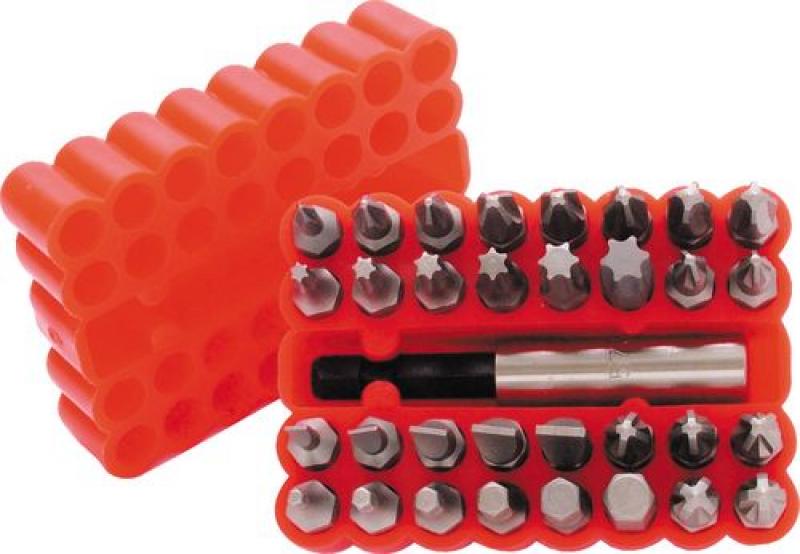 33-teiliger Satz, Inhalt: Pozidriv® 2 x Nr.1, 3 x Nr.2, 2 x Nr.3. Kreuzschlitz 1 x Nr.0, 2 x Nr.1, 3 x Nr.2, 2 x Nr.3. Schlitz 3.0mm, 4.0mm, 5.0mm, 6.0mm, 6.5mm. Torx® T x 10, T x 15, T x 20, T x 25, T x 30, T x 40. Sechskant 2.0mm, 2.5mm, 3.0mm, 4.0mm, 5.0mm, 6.0mm.