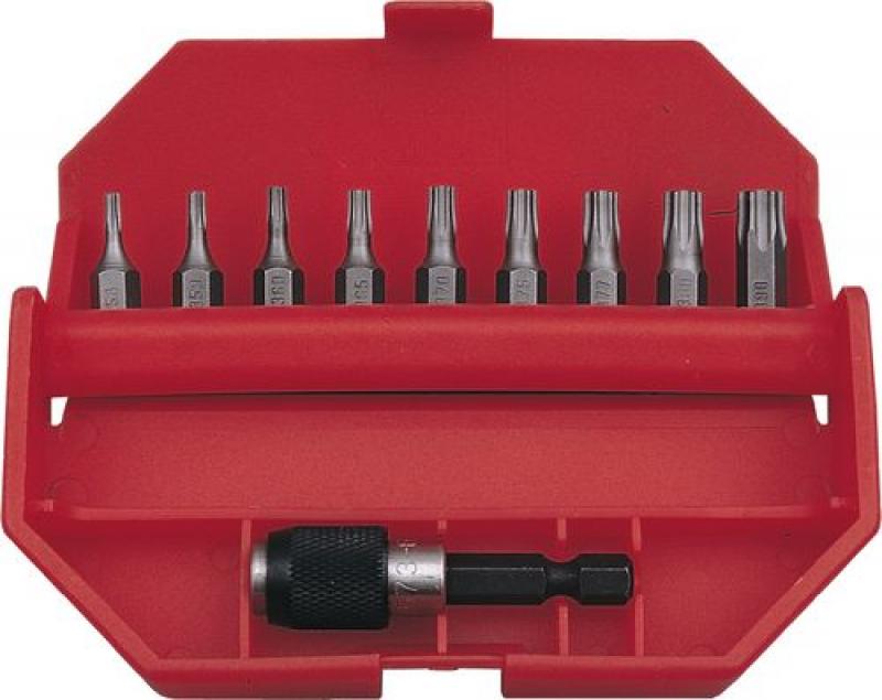 Torx® Bit-Satz 10-teiliger Satz, Inhalt: T8, 9, 10, 15, 20, 25, 27, 30 und 40. Alle 1/4” Sechskant x 25mm Gesamtlänge, komplett mit Schnellwechselfutter und 1/4”Sechskant-Bit Adapter.