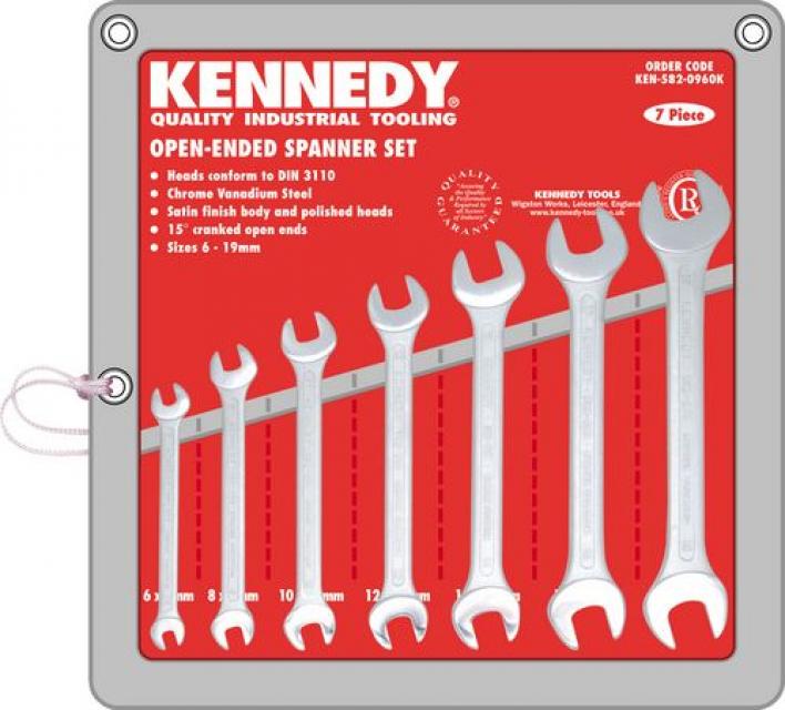 Doppelmaulschlüssel-Satz in Industriequalität Aus Chrom-Vanadium-Stahl, mattiert und mit hochglanzpolierten Köpfen mit einer 15° Maulstellung. 7-teiliger Satz, metrisch, Inhalt: 6 x 7, 8 x 9, 10 x 11, 12 x 13, 14 x 15, 16 x 17 und 18 x 19mm.