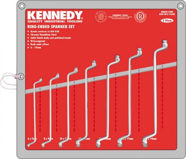 Doppelringschlüssel-Satz, gekröpft Aus Chrom-Vanadium-Stahl, mattiert, Köpfe poliert, mit Doppelsechskant und gekröpft. Gemäß DIN 838 Metrisch & AF 7-teiliger Satz, metrisch, Inhalt: 6 x 7, 8 x 9, 10 x 11, 12 x 13, 14 x 15, 16 x 17 und 18 x 19mm.