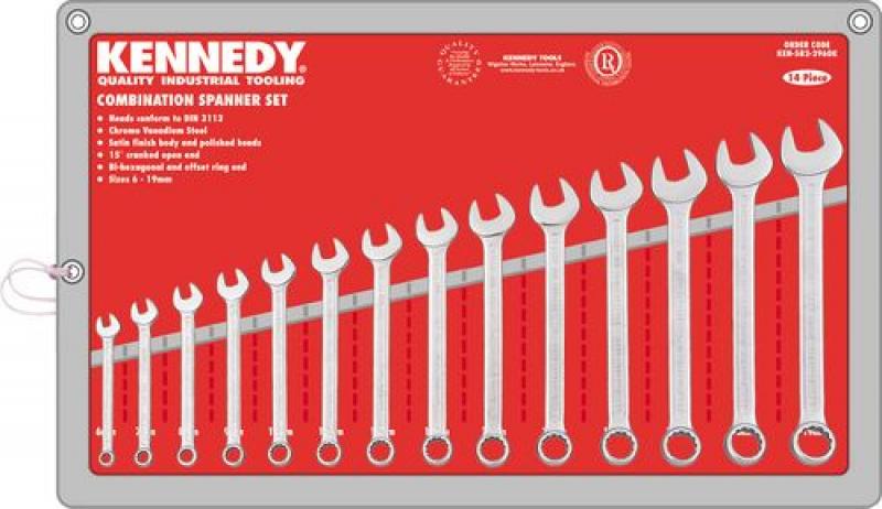 Ring-Maulschlüssel-Satz, Industriequalität Aus Chrom-Vanadium-Stahl, Körper mattiert und Kopf hochglanzpoliert. 15° Maulstellung und Ringende gekröpft. 14-teiliger Satz, metrisch, Inhalt: 6, 7, 8, 9, 10, 11, 12, 13, 14, 15, 16, 17, 18 & 19mm.