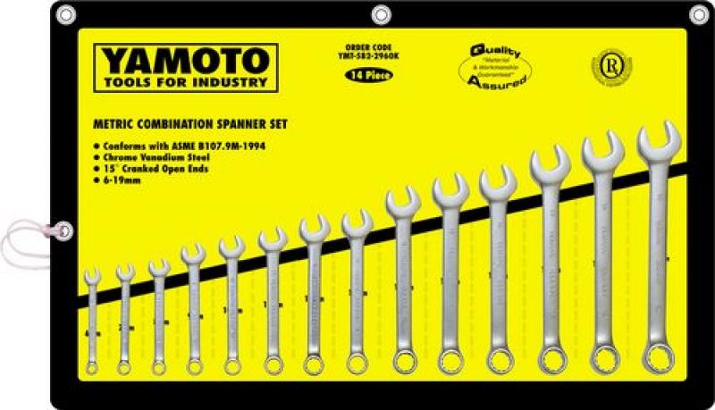 Ring-Maulschlüssel-Satz Aus Chrom-Vanadium-Stahl mit poliertem Kopf und 15° Maulstellung. Gemäß ASME B107.6. 14-teiliger Satz, metrisch, Inhalt: 6, 7, 8, 9, 10, 11, 12, 13, 14, 15, 16, 17, 18 und 19mm.