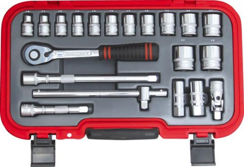 Zubehör: Umschaltknarre, Quergriff mit Gleitstück, Kardangelenk, 125 und 250mm Verlängerungen. Robuster, vorgeformter Koffer mit Vorhängeschlossbohrung und Komfortgriff.
