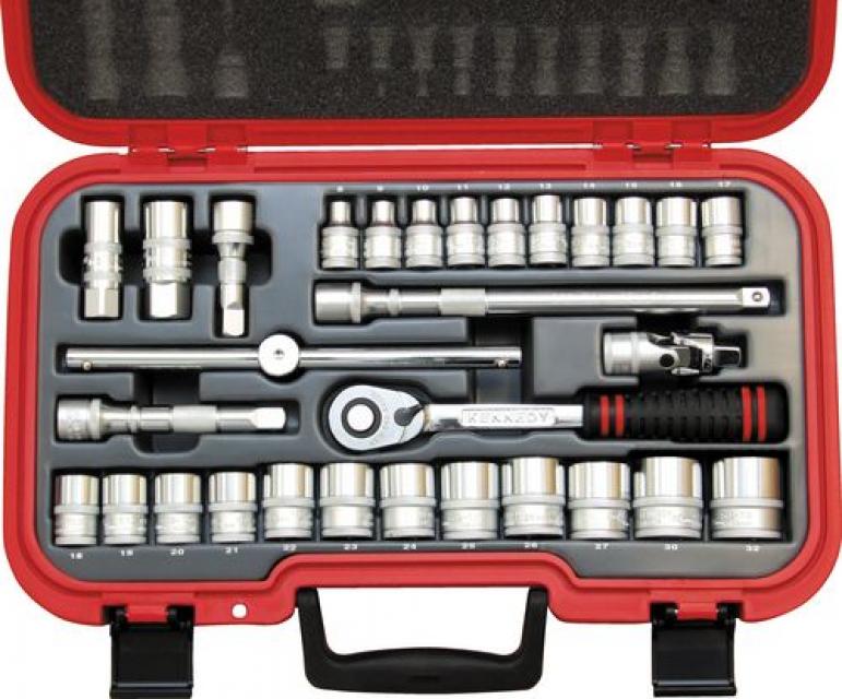 1/2” Vierkantantrieb. Alle Kennedy Profi-Steckschlüsseleinsätze sind gerändelt für bessere Griffigkeit und schnellen Werkzeugwechsel. 12 Punkt Doppelsechskant Seitenantrieb für eine Schraubenkopf-schonende Drehkraftübertragung. Aus Chrom-Vanadium-Stahl, vollverchromt, spiegelglanzpoliert und aluminiumfrei für funkenfreies Arbeiten. Abgeschrägte Führungskante für einfaches Positionieren.