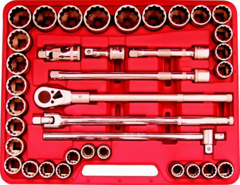 3/4” Antrieb. Alle Kennedy Profi-Steckschlüsseleinsätze sind gerändelt für bessere Griffigkeit und schnellen Werkzeugwechsel. 12 Punkt Doppelsechskant Seitenantrieb für eine Schraubenkopf-schonende höhere Drehkraftübertragung. Aus Chrom-Vanadium-Stahl, vollverchromt, spiegelglanzpoliert und aluminiumfrei für funkenfreies Arbeiten. Abgeschrägte Führungskante für einfaches Positionieren.