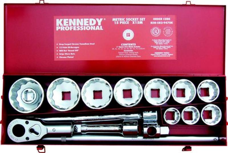 Steckschlüssel-Satz Metrisch - kurz 1" Vierkantantrieb. Steckschlüsseleinsätze: 36, 41, 46, 50, 55, 60, 65, 70, 75 und 80mm. Zubehör: Knarren- und Quergriff-Gleitkopf, 550mm Universalgriffstange, 200 und 400mm Verlängerungen.
