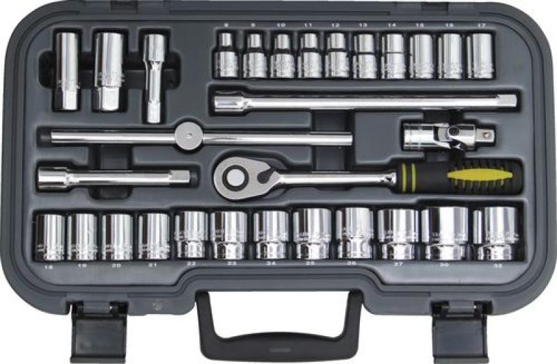 Zubehör: Umschaltknarre mit Gummigriff und Schnelllösefunktion, Quergriff, Kardangelenk, 75, 125 und 250mm Verlängerungen. Robuster, vorgeformter Koffer mit Vorhängeschlossbohrung und Komfortgriff.