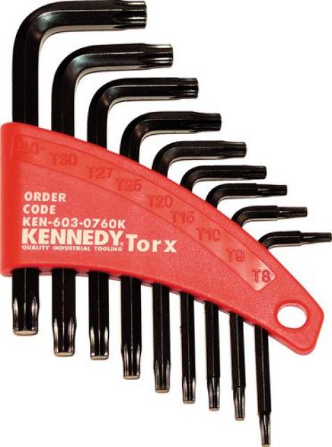 Torx® Winkelschraubendreher-Satz Aus Chrom-Molybdän-Stahl. Torx ist ein eingetragenes Warenzeichen von Camcar/Textron. 9-teiliger Satz, Inhalt: T8, T9, T10, T15, T20, T25, T27, T30 und T40. Wird in einem Kunststoffclip geliefert.
