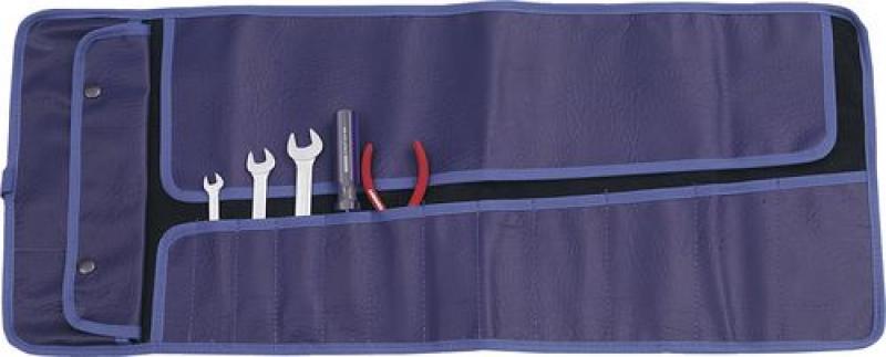 Wasserfeste, durchstichbeständige und fäulnissichere PVC-Außenhülle mit weichem, kratzfreiem Rayon-Innenfutter zum Schutz der Werkzeuge. Allzweck-Rolltasche mit 12 Taschen und 2 Beuteln. Umschlagklappe zur Sicherung der Werkzeuge und zwei Gewebe-Verschlußriemen. Größe 750 x 310mm.