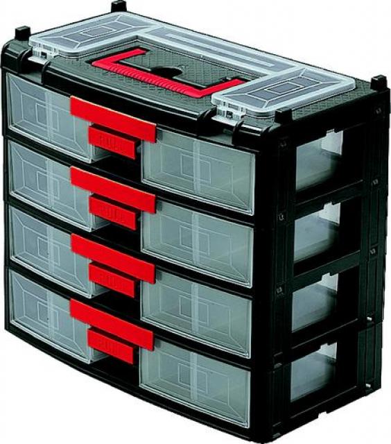 Aus hochstoßfestem Polypropylen-Copolymer mit transparenten Schubladen. Dreigeteiltes Oberfach mit blickdichtem Deckel und Verschlusslaschen. Jedes durchsichtige Innenfach hat drei herausnehmbare Trennwände und eine Transportverriegelung. Versenkter Tragegriff und Führungsstifte, um mehrere Werkzeugkästen aufeinander zu stapeln.