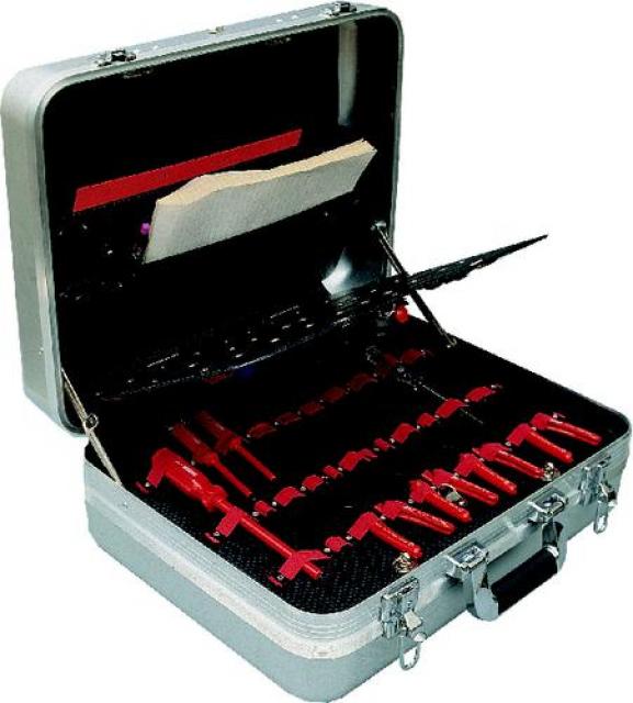 Stabiler, stoßfester Koffer. Verstärkte Kanten und Scharniere. Gummigepolsterter Komfortgriff. 2 passende, aufklappbare Werkzeugtafeln mit elastischen Werkzeug-Halteschlaufen,