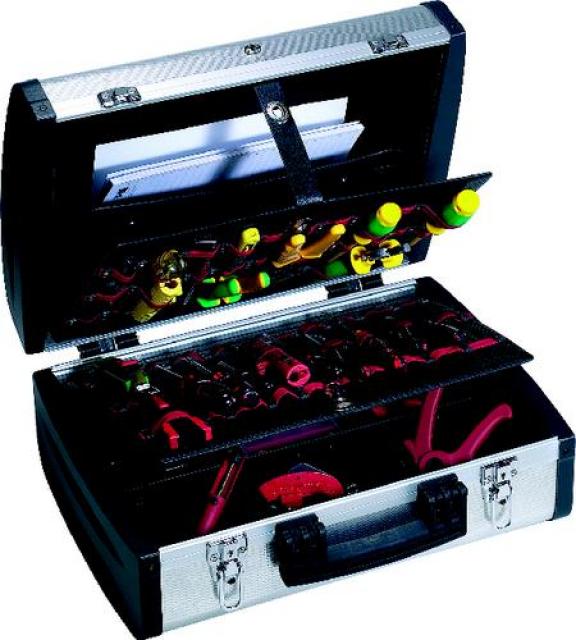 2 verchromte Stahlschlösser mit Schlüsseln, robuster Kunststoffgriff und 4 Gummifüße. 2 gesicherte, klappbare Werkzeugtafeln innen, mit je 31 elastischen Halteschlaufen. Ausdehnbares Dokumentenfach, 2 kleine Sortimentkästen und ein individuell gestaltbares Aufbewahrungsfach mit umsteckbaren Trennwänden. Größe LxTxH 466x340x190mm. Werkzeug nicht inbegriffen.