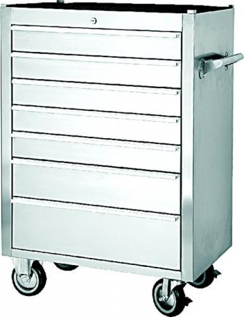 Aus starkwandigem Edelstahl mit doppelten Seitenwänden und stabilen, geschweißten Verbindungen. Leichtläufige Kugellagerauszüge. Zentralverriegelung. Sehr starke 125 x 50mm Laufrollen mit 2 Bremsen, belastbar bis zu 100kg/Rolle.