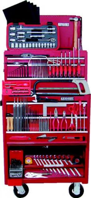 Lehrling-Werkzeugausstattung, 208-teilig Wird in einem Werkzeugwagen mit 3 Schubfächern und einer Werkzeugkiste mit 3 Schubfächern geliefert. Aus dickwandigem Stahl mit doppelten Seitenwänden und geschweißten Verbindungen für zusätzliche Stabilität. Mit strapazierfähiger Epoxid-Pulverbeschichtung. Schubfächer mit Vollauszug. Kugelgelagerte Auszüge, doppelte Auszüge am untersten Schubfach. Wird mit Ablagematte und Schubfacheinlagen geliefert. Zentralverriegelung. Sehr starke 125 x 50mm Laufrollen mit 2 Bremsen, belastbar bis zu 100kg/Rolle.