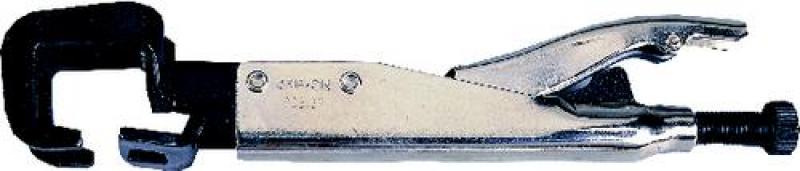 Klemme für geflanschte Stoßverbindungen. Backenbreite: 45mm. Tiefe: 25mm. Zur Karosseriereparatur und Stahlfertigung. Chrom-Stahl Körper mit schmalen Backen. Gerade Kraftübertragung der Backen ermöglicht durch Löcher hindurch zu greifen. Druckknopf-Entriegelung, um die Zange einhändig lösen zu können. Kein provisorisches Schweißen oder Vorschweißen nötig, um Karosserieteile zur Montage zu halten. Greifweite 0-15mm, Gesamtlänge 210mm.
