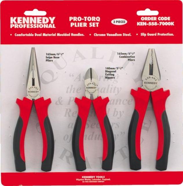 Aus speziellen, ausgewählten Stahlsorten. Mehrkomponentengriff, aus einem Polypropylen-Kern für Stärke und Haltbarkeit, und einer weichen thermoplastischen Hülle für rutschfesten Griff. 3-teiliger Satz, Inhalt: Storchschnabelzange 165mm, Seitenschneider 140mm, Kombizange 165mm