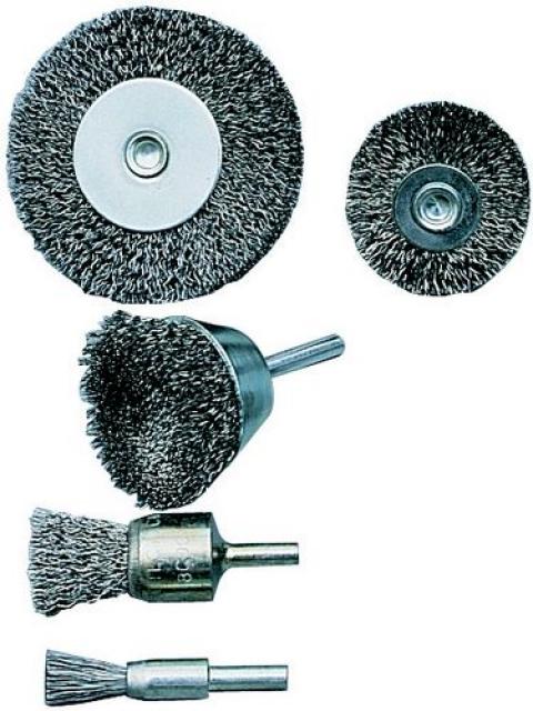 Industrieller Drahtbürsten-Satz Lieferung in gekennzeichnetem, durchsichtigen Beutel. 5-teiliger Satz, Inhalt (jeweils 1): Rundbürsten mit Schaft 30 x 12, 50 x 10 und 50 x 20. Pinselbürste 12 x 20, Pinselbürste, zulaufend 12 x 20.
