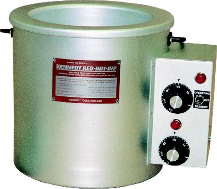 Schmelztiegel für das industrielle Schmelzen von Wachsen, Klebstoffen, Kunststoffen usw. Der Schmelztiegel wird elektrisch geheizt und thermostatisch zwischen 50°C und 200°C temperaturgeregelt. Aus eloxiertem Aluminium mit einer Keramikfaserdämmung. Mit 2m Kabel, Stecker mit Sicherung, Tragegriff, doppelwandigem wärmeisolierendem Deckel,