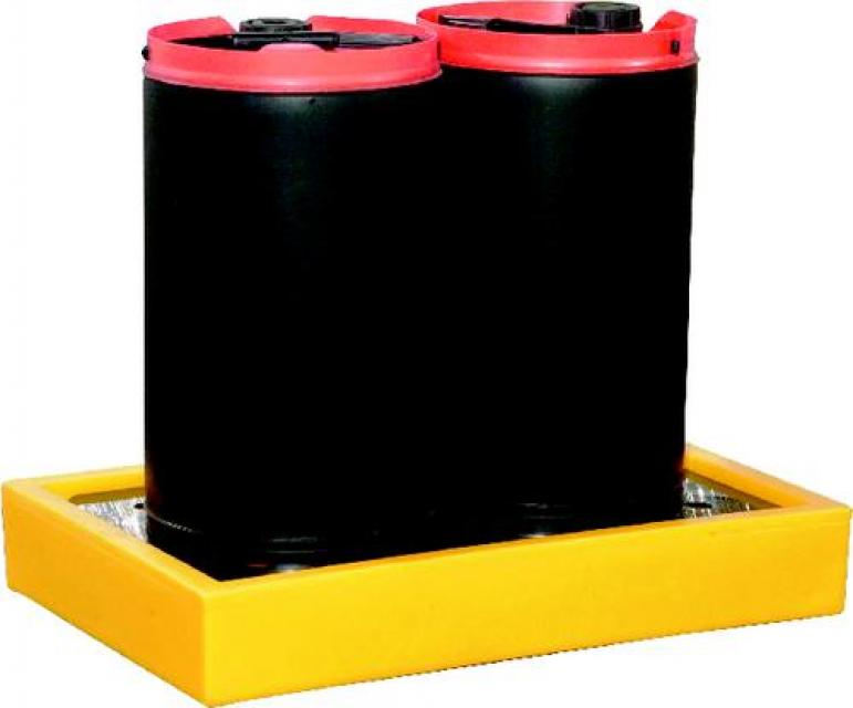 Auffangwanne für Fässer Für die externe Aufbewahrung von 25 Liter Fässern in Warenlagern oder Arbeitstätten. SWB2: Auffangwanne für zwei 25l Fässer, Auffangvolumen 55l. Maße 700x450x110mm.