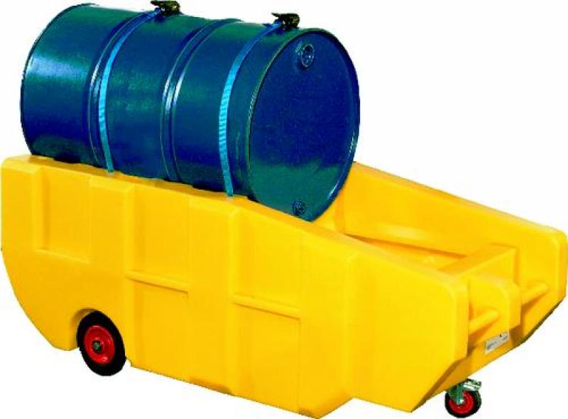 Fahrbare Abfüllstation und Auffangwanne für 205 Liter Fässer. Fass wird mit Spanngurt befestigt.