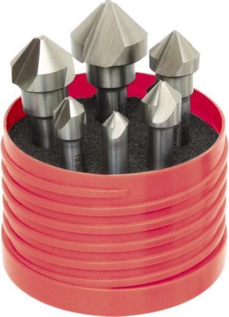 90° Kegelsenker-Satz Zum Entgraten und Abschrägen. Gerader Schaft, geschliffene Spitze, 90°-Winkel. Wird in einer Holzkassette geliefert. Hergestellt nach BS328 : Part 5 : 1983. 6-teiliger Satz, Inhalt: Größen 8, 10, 12.5, 16, 20 und 25mm.