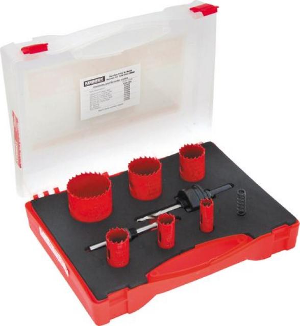 Hochwertiger Satz mit Wechselverzahnung für Elektriker. Beinhaltet verschiedene Größen, die speziell für die jeweilige Anwendung passen. Wird im robusten Kunststoffkoffer geliefert. 9-teiliger Satz, Inhalt: Säge 16, 20, 25, 32, 40, 51mm. Feder K7. Dorne K1 & K10.