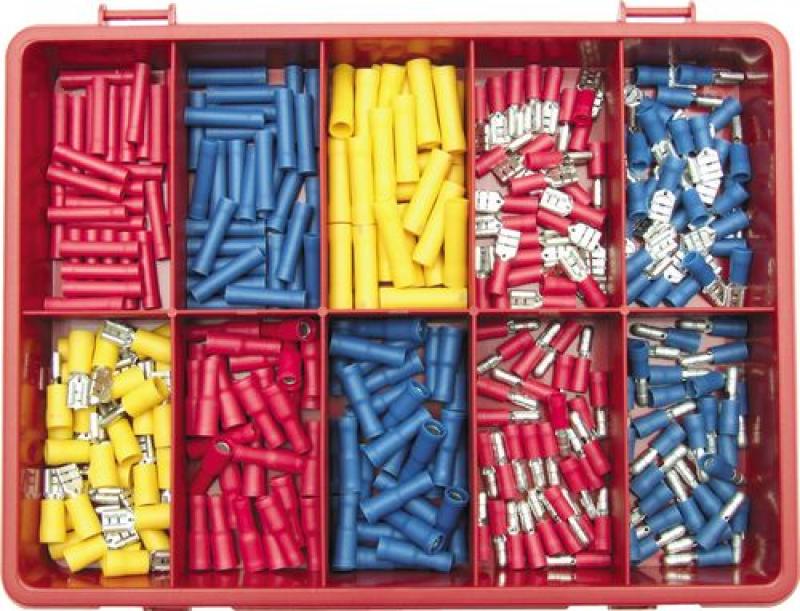 Aderendhülsen&Kabelschuh-Zubehör-Sortiment Rot/Blau/Gelb Inhalt: Rundstecker rot, blau; Stoßverbinder rot, blau, gelb; Rundsteckhülse rot, blau; Flachsteckhülsen mit Abzweig rot, blau und gelb.