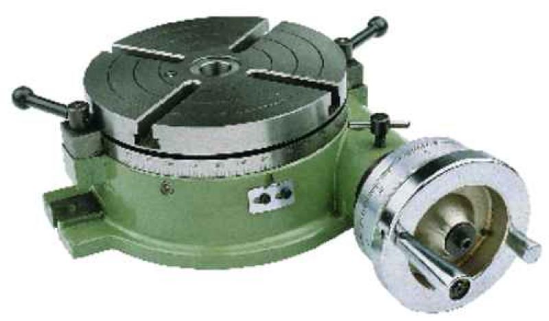 Hergestellt aus hochwertigem Gusseisen. Mit auskuppelbarem Schneckengetriebe, welches schnelles Drehen erlaubt. Eine Kurbelumdrehung entspricht vier Grad an der Scheibe. Ø 315mm, Mittelloch 4MT, 6 T-Nuten. 60kg. Als Teilapparat in der vertikalen Position oder als herkömmlicher Rundtisch für Anreißarbeiten, Bohrungen oder Winkelbestimmungen, usw. verwendbar.